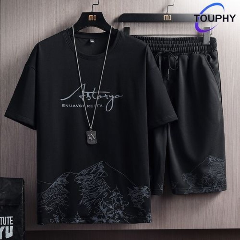 TOUPHY T-Shirts +Shorts 100% Cotton Men's Short Sleeve Set-Black