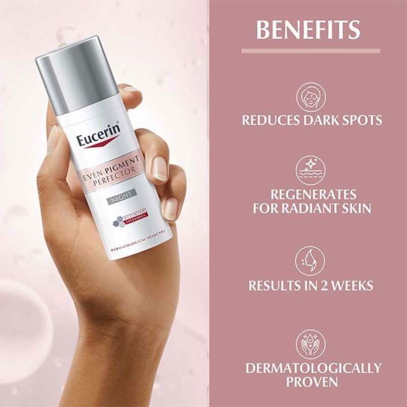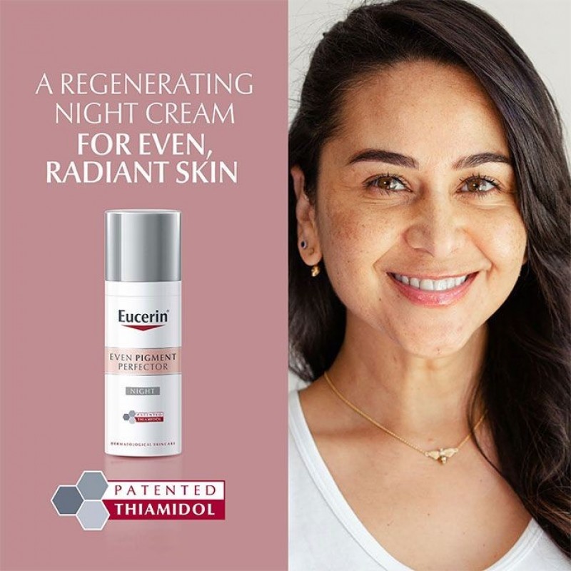 Eucerin Even Pigment Perfector Night Cream contains Thiamidol®, an effective and patented ingredient that acts at the root cause of dark spots by reducing melanin production. It is clinically and dermatologically proven to reduce dark marks and prevent their re-appearance. First results are visible from 2 weeks and improve continuously with regular use. Tested on South African skin.