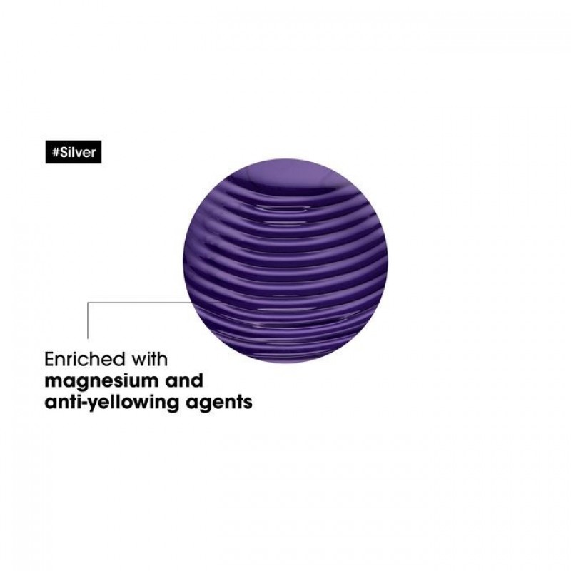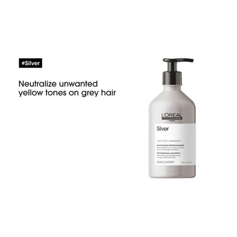 Showcase the beauty of grey, white or light blonde hair with L'Oréal Professionnel Silver Shampoo. The neutralising system, enriched with magnesium and anti-yellowing agents, counteracts unwanted brassy tones.